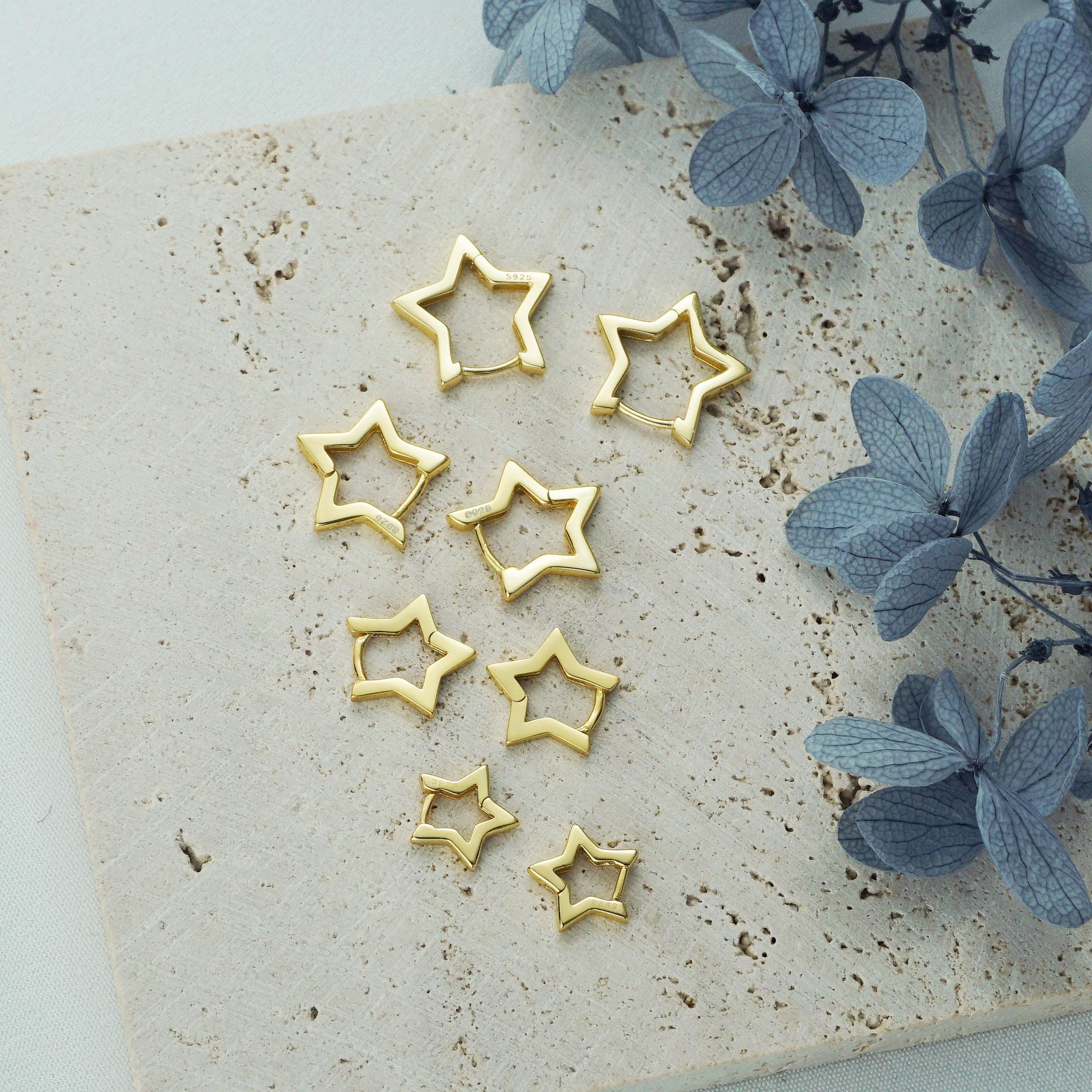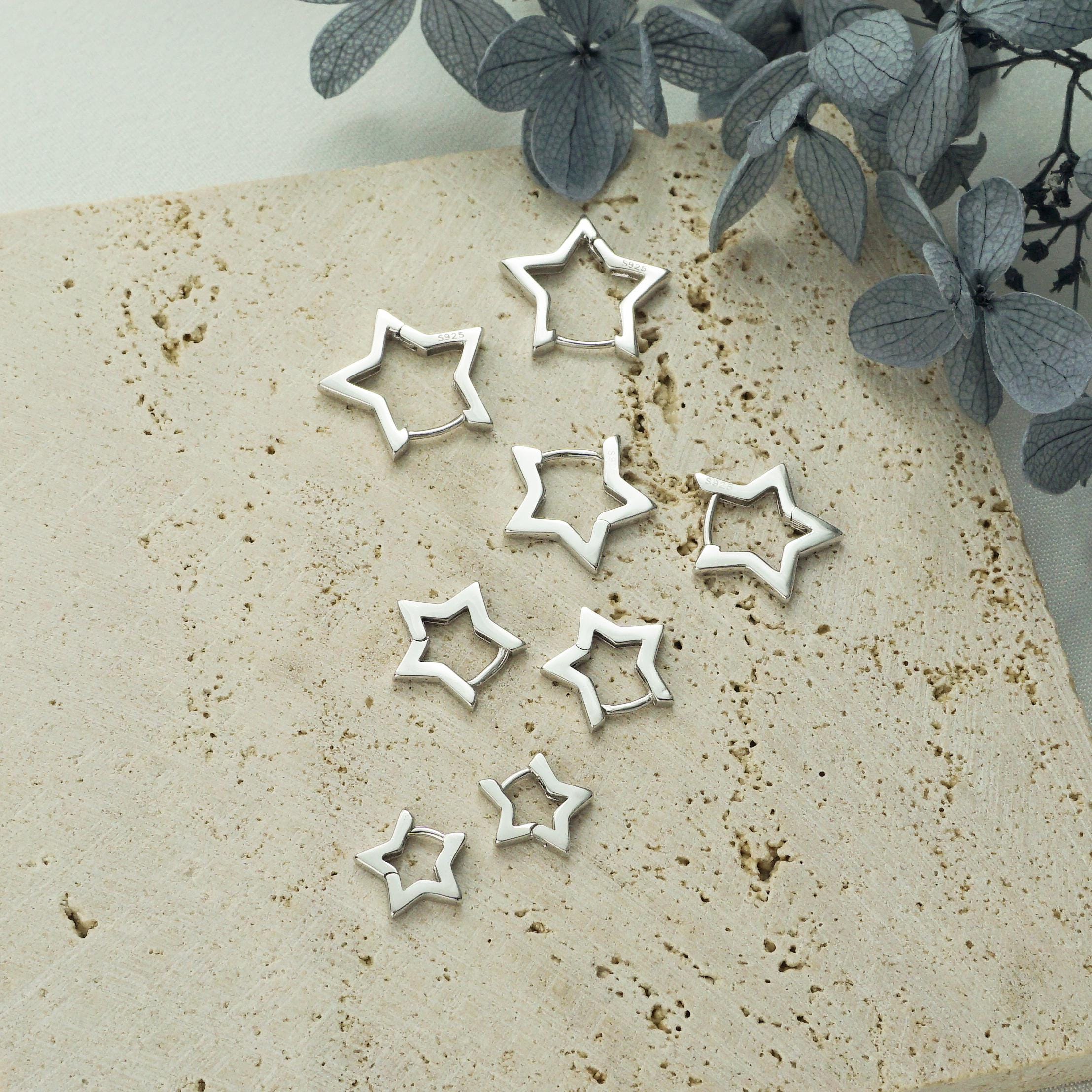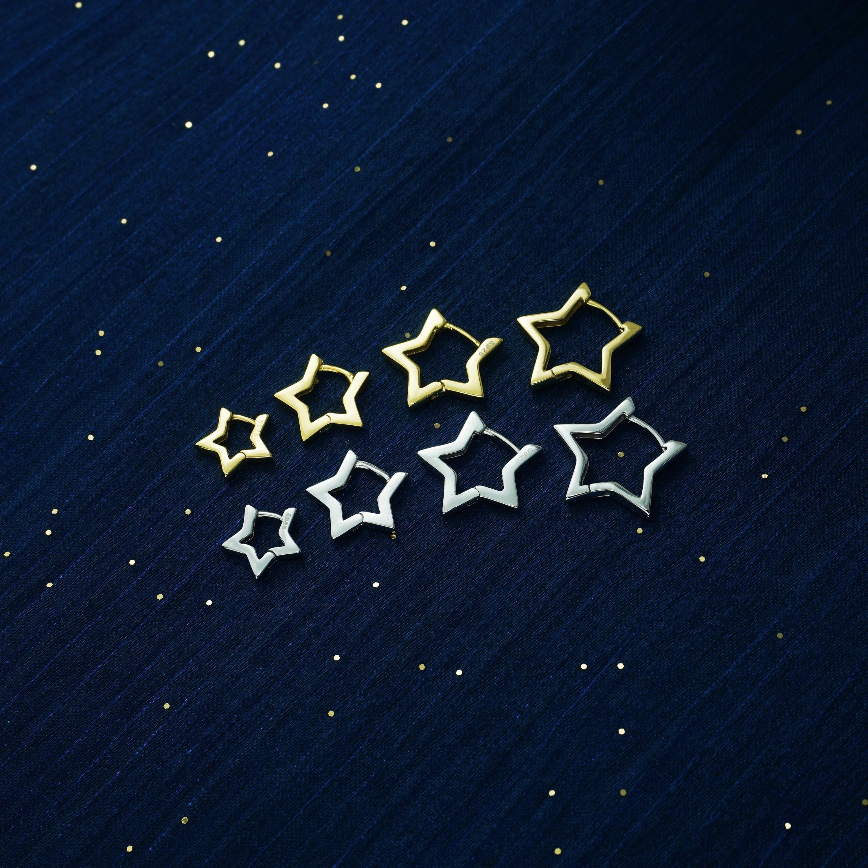 Pair of Star Huggie Hoop Earring in Sterling Silver or Plated Gold, 4 Loop Sizes Available, Comfy Little Ear Stacking Piercing Cuff Ring
