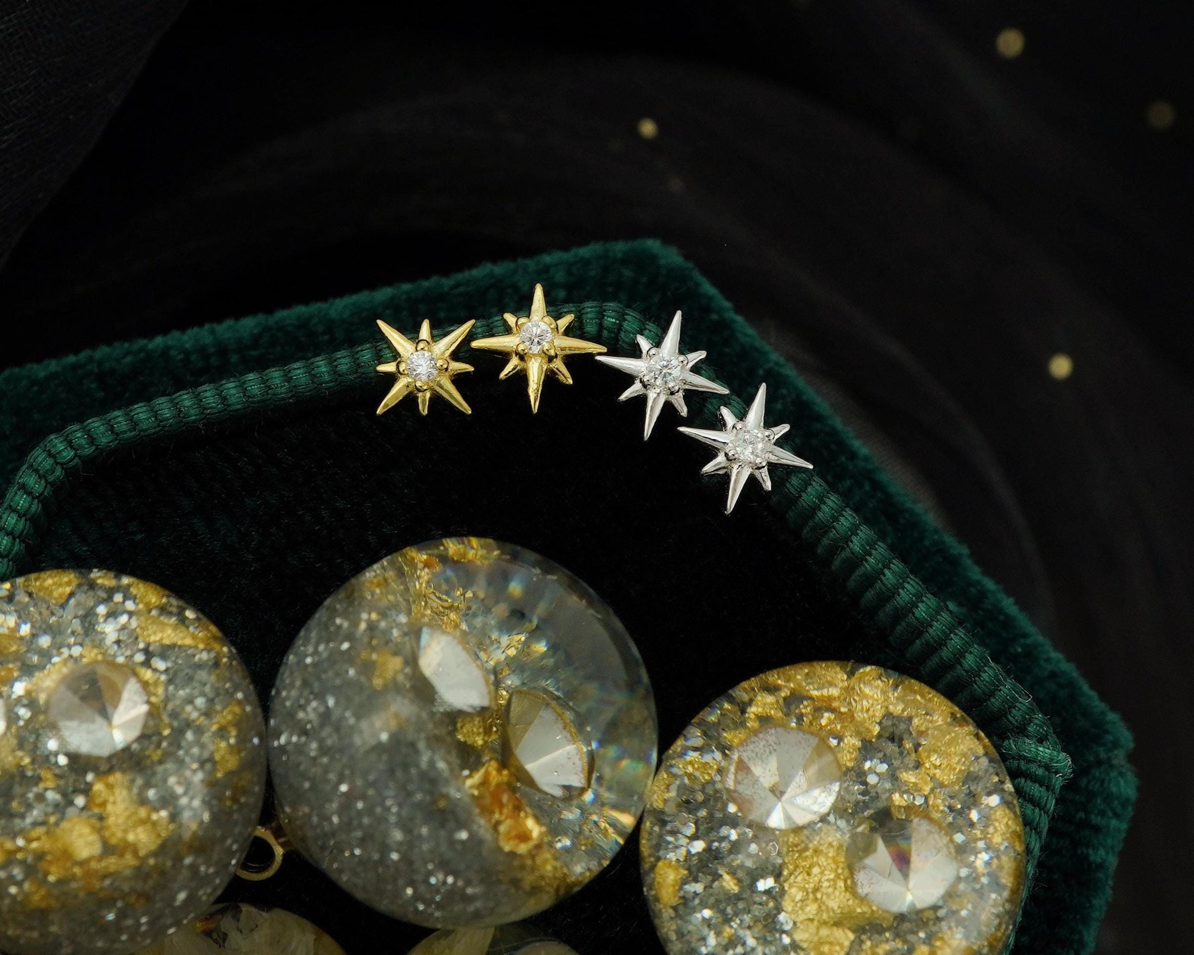 Pair of Starburst Stud Earrings in Silver/ Plated Gold, Celestial Star Burst Cosmic Look with CZ Crystal, Twinkly Delicate Ear Lobe Piercing