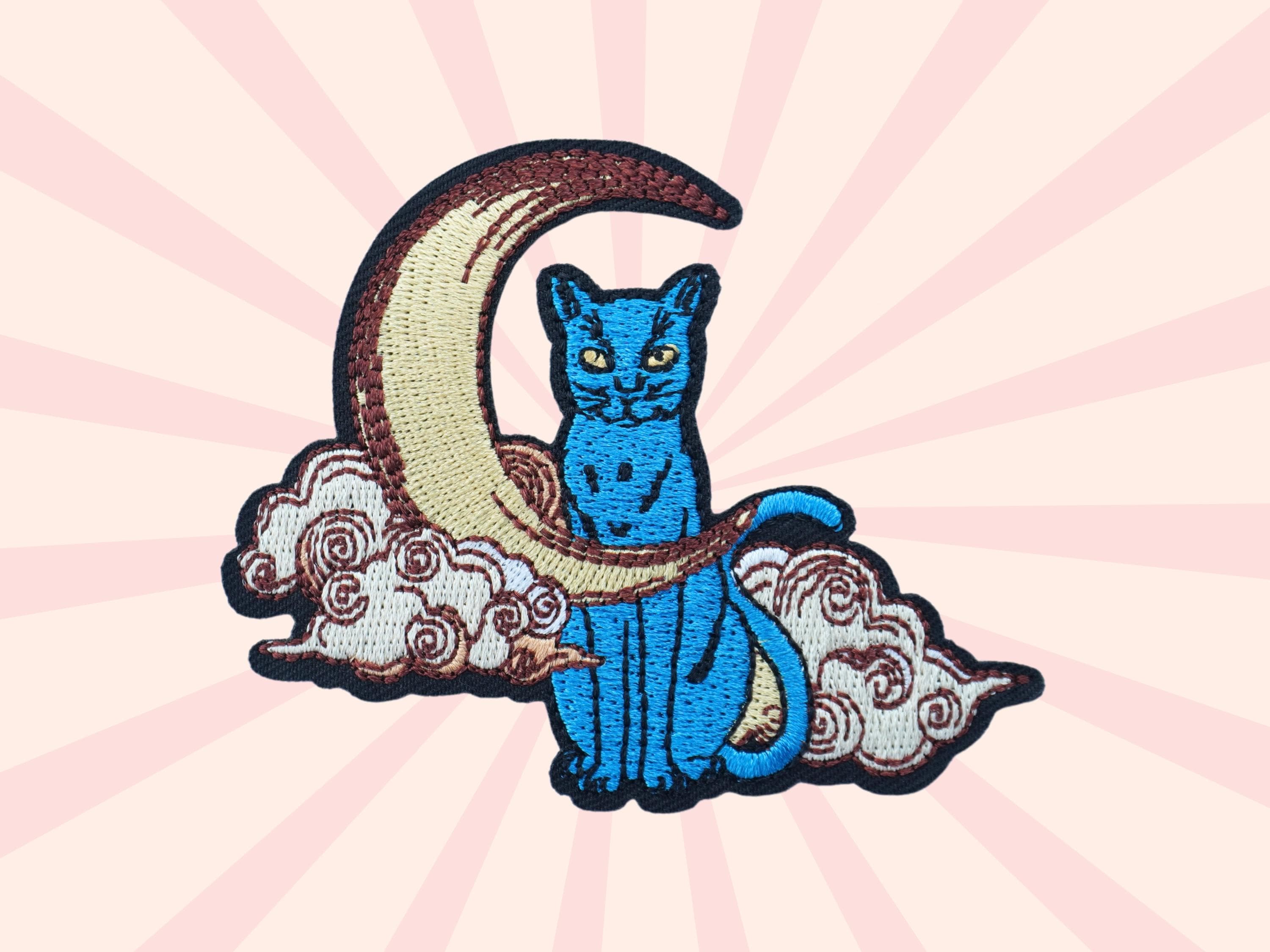 Crescent Moon Blue Cat Gothic Embroidered Iron / Sewing on Applique, Kitten Fan Patch Decor, DIY Sew Supply for Denim, Cap, Bag, Backpack