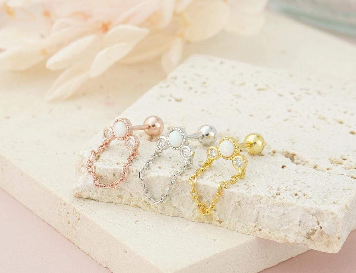 1 pc of Opal & CZ Ball Screw Back Stud Earring with Chain in Sterling Silver, Rose Gold or 18ct Gold Plated, Opulent Trio Gem Ear Piercing