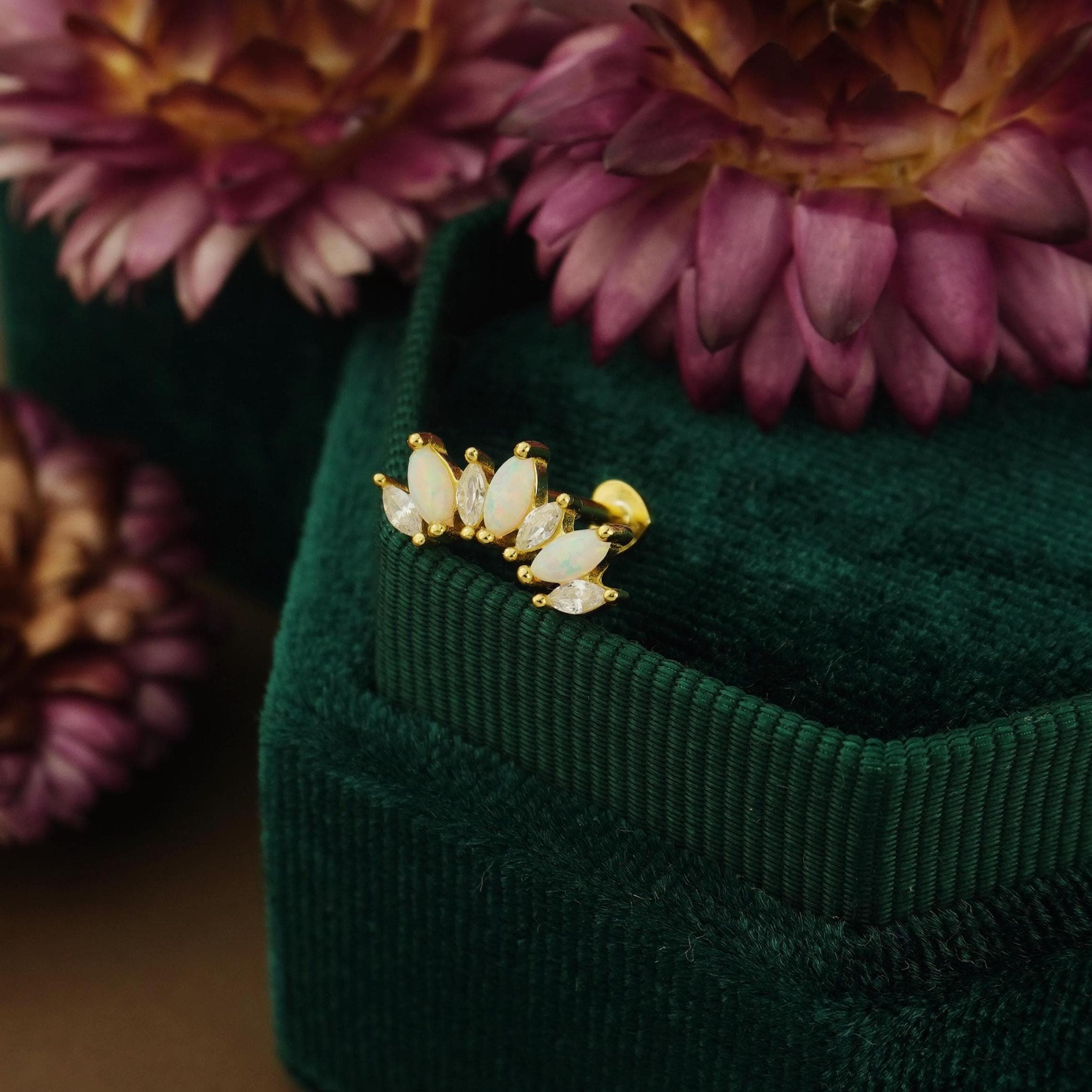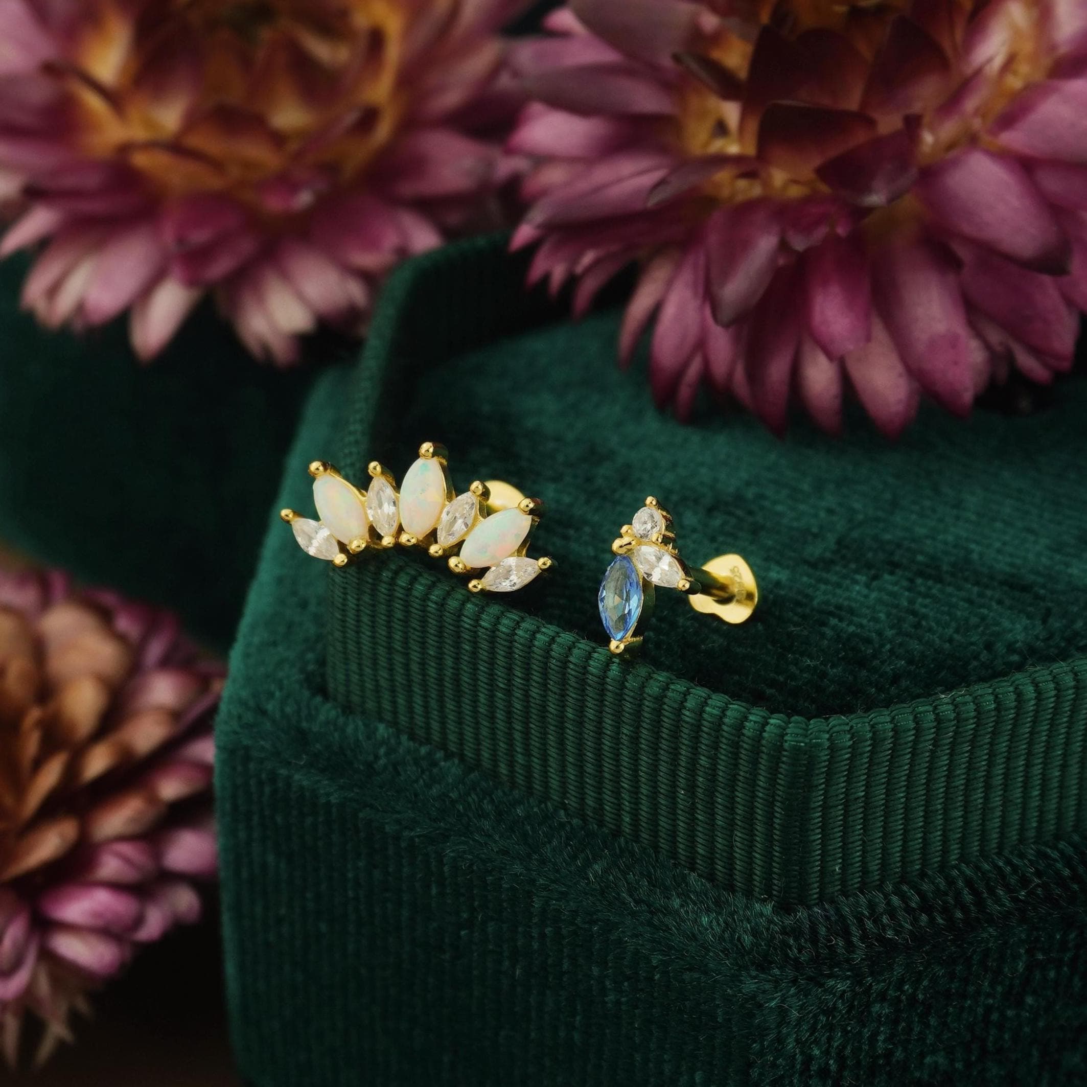 1pc Flat Heart Shape Screw Back Marquise Opal / Blue CZ Stud Earring in 18k Gold Plated over Sterling Silver, Lobe Tragus Cartilage Piercing