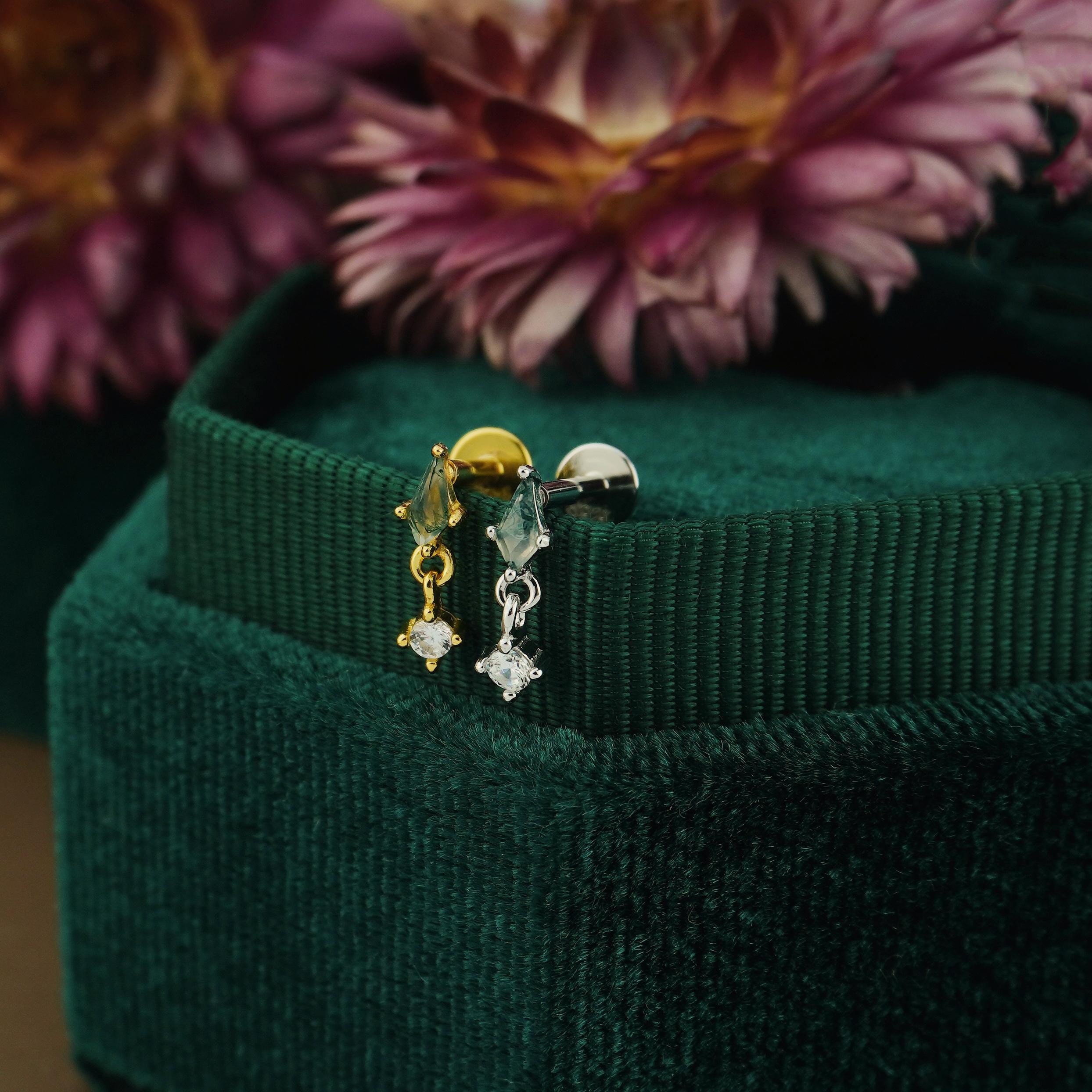 1 pc Natural Green Moss Agate Kite Drop Flat Back Stud Earring in Sterling Silver or Plated Gold, Dangly CZ Helix Tragus Cartilage Piercing