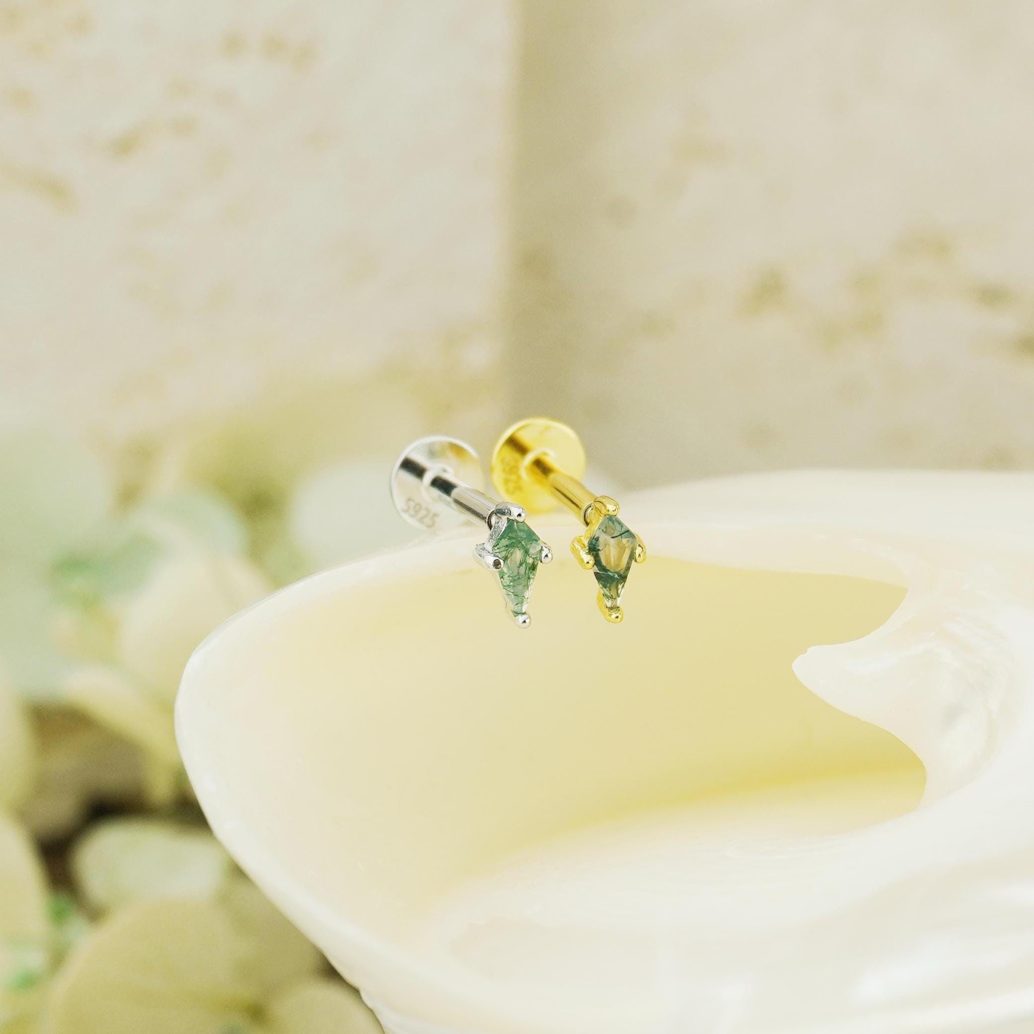 1pc Tiny Natural Green Moss Agate Flat Back Stud Earring in Sterling Silver or Plated Gold, Dainty Marquise/Kite Shape Helix Tragus Piercing