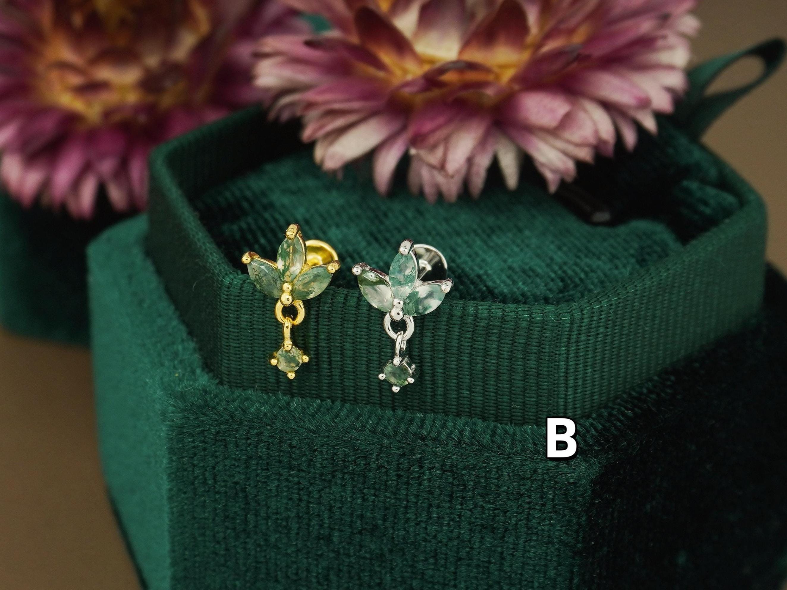 1pc Natural Green Moss Agate Flat Back Stud Earring in Sterling Silver/ Plated Gold, Dainty Double/ Triple Marquise Helix Tragus Lobe Pierce