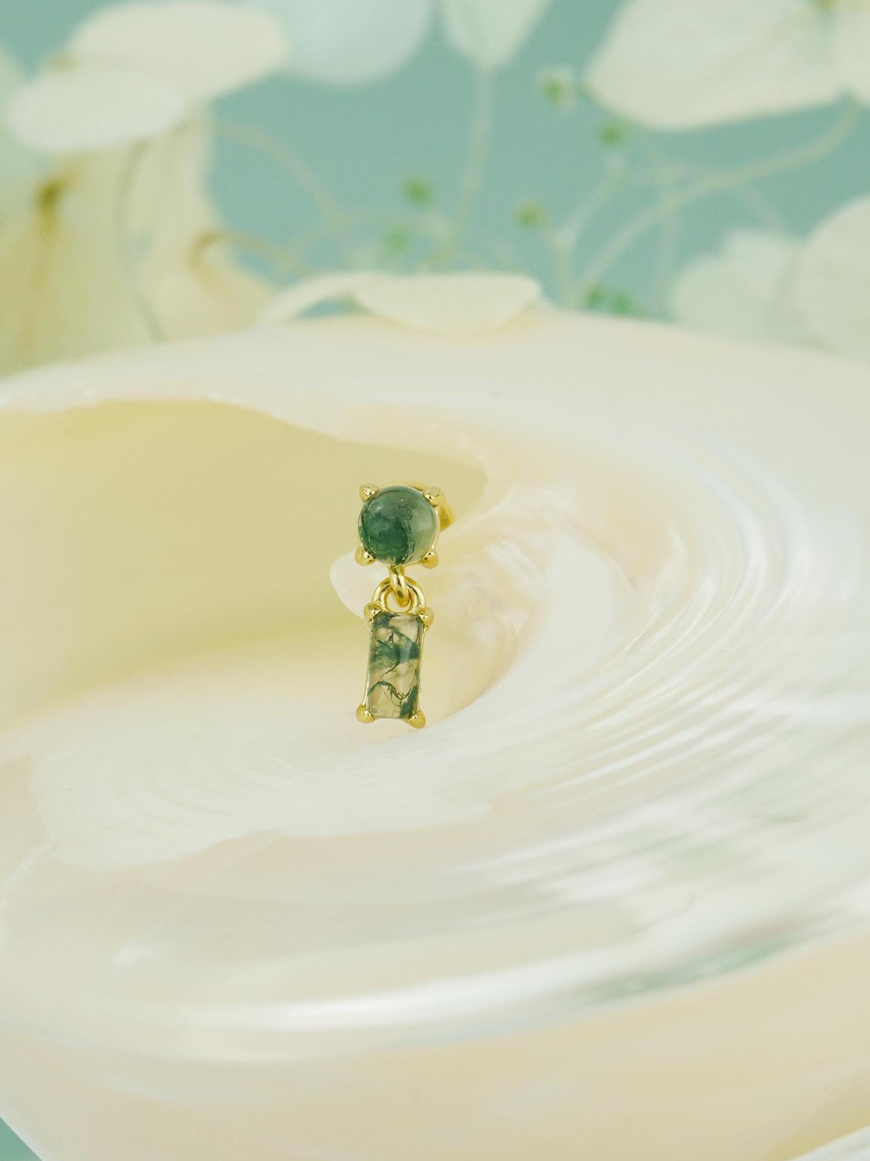1pc Natural Green Moss Agate Cabochon with Dangly Baguette Flat Back Stud Earring, Gold Plated over Sterling Silver, Helix Lobe Piercing