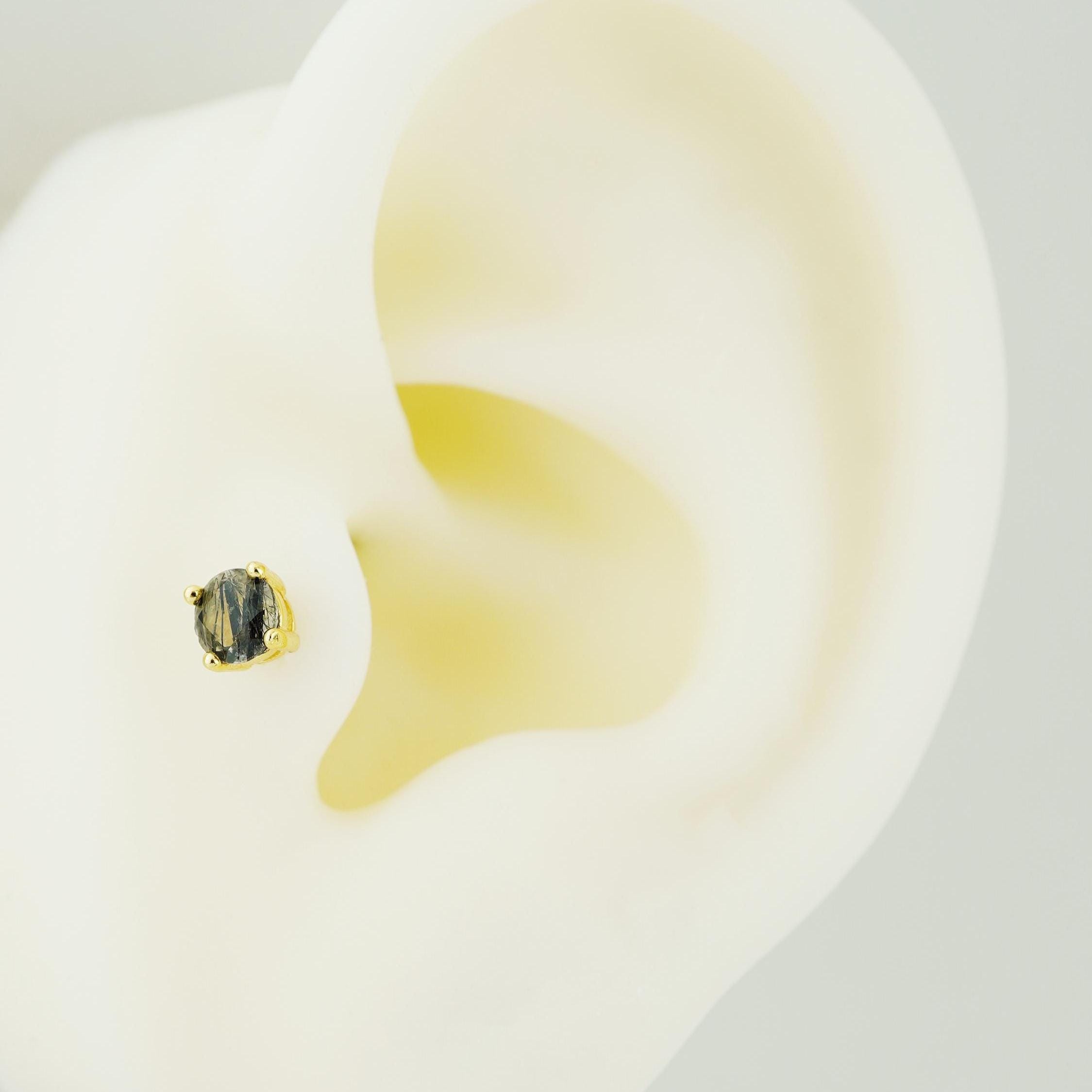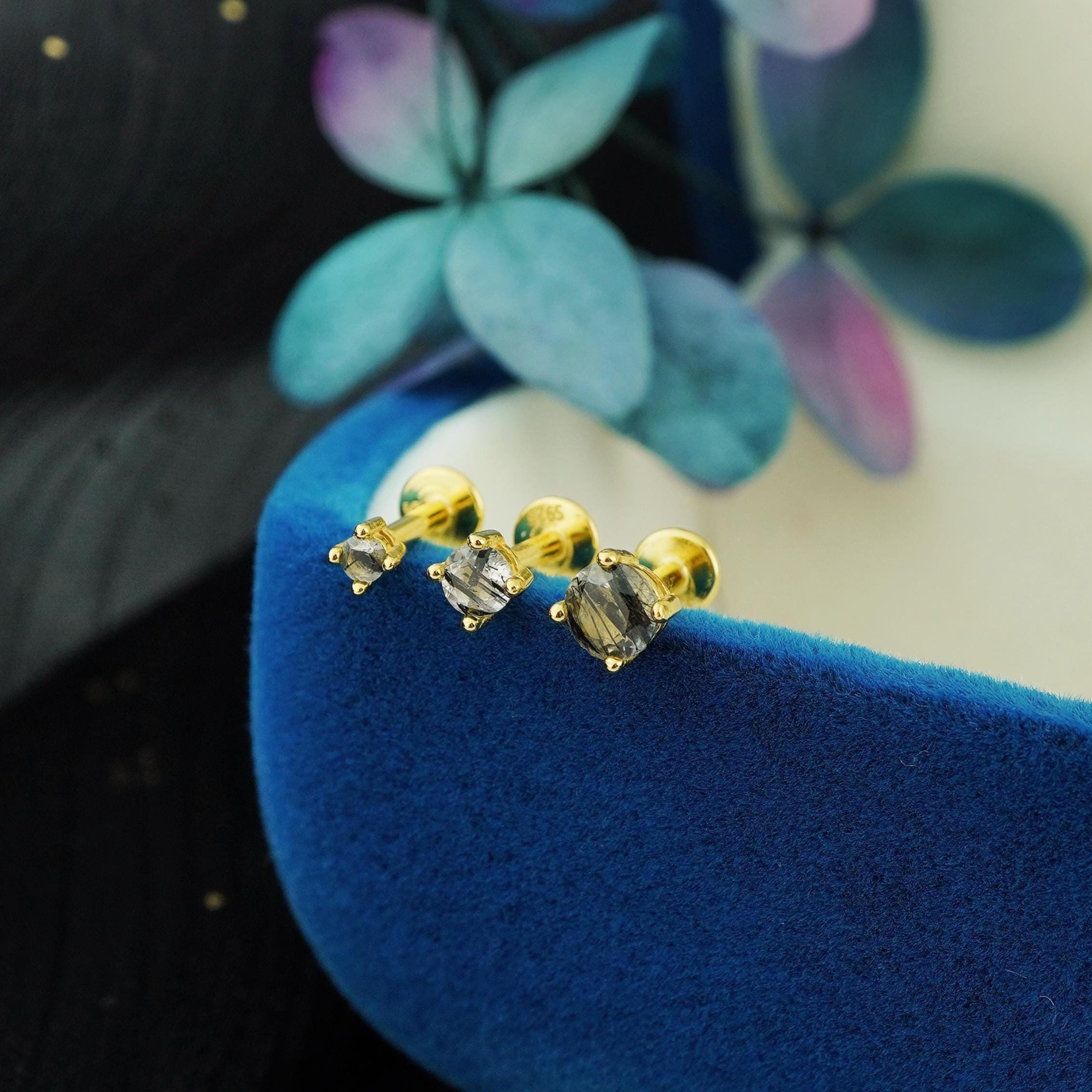 1pc Natural Black Rutile Quartz 4 Prong Solitaire Flat Back Stud Earring in Gold Plated over Sterling Silver, Cartilage Helix Lobe Piercing